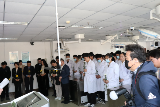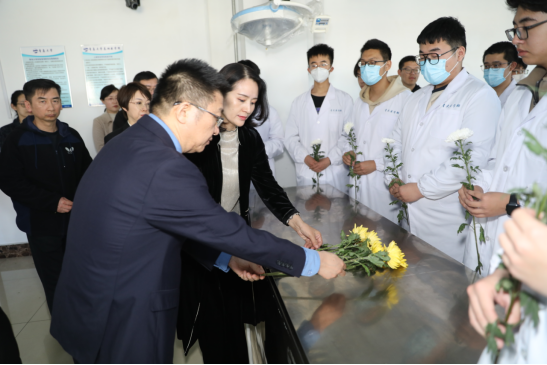 员工代表发言后,人体形态学课程组王双燕老师带领同学们宣读了解剖学誓词。无言良师,授吾医理;敬若先贤,临如活体;正心恭行,追深辨细;德彰术精,修成大医”。铮铮誓言,既是对无言老师的感恩和敬意,更是对医员工们学习奋进的鞭策。现场人员集体向大体老师献花、静默致敬。开课仪式后,与会领导和嘉宾参观了williamhill体育在线平台医学发展史馆、人体生命科学馆,并围绕“生命·礼赞”缅怀纪念无语良师举行了座谈会。