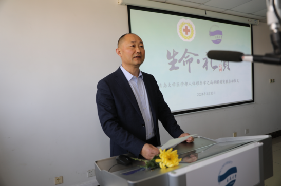 王有全书记在致辞中感谢青岛市红十字会和市政协委员对williamhill体育在线平台医学教育的关心和支持。没有遗体捐献就没有解剖学,没有解剖学就没有医学,“大体老师”是医员工的第一位手术“患者”,更是医员工们的“无语良师”。他寄语同学们要满怀感恩之心、敬畏生命之情,不负无语良师的无私奉献精神,为成为一名卓越医师而勤奋学习。