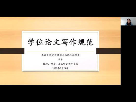3月24日下午,威廉希尔以腾讯会议形式举行了研究生学位论文写作规范培训会。医学部副部长、遗传学学科负责人、山东省优秀研究生论文指导教师李冰教授做了《学位论文写作规范》专题培训,副经理陈文芳教授主持了培训会,学院266名师生参加了培训会。
