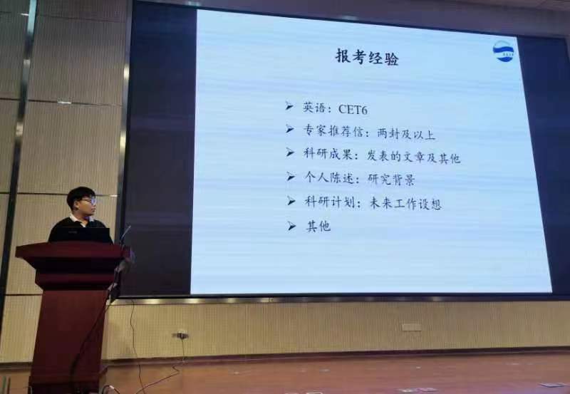冯振东同学从往届研究生考博就业情况、为什么要考博、怎么考博三方面进行阐述。他说读博有助于员工提高自身知识水平和能力,希望师弟师妹们在硕士阶段积极参与学术科研项目和课题,发表高水平论文,尽早树立目标选好方向,定期与导师交流汇报。