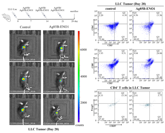肺癌是发病率和死亡率最高的癌症之一。然而,传统癌症治疗的效果是有限的。本研究设计了一种基于肿瘤相关抗原mENO1的治疗性癌症疫苗,通过对小鼠皮下肿瘤模型的治疗发现,Ag85B-ENO146-82疫苗增强了肿瘤中CD4+ T和CD8+ T细胞的浸润,增加CD8+ T淋巴细胞分泌IFN-γ和TNF-α,并促进巨噬细胞向M1表型极化。本研究为通过使用治疗性肿瘤相关抗原多肽疫苗治疗小鼠肺癌提供了重要的理论和实验依据。